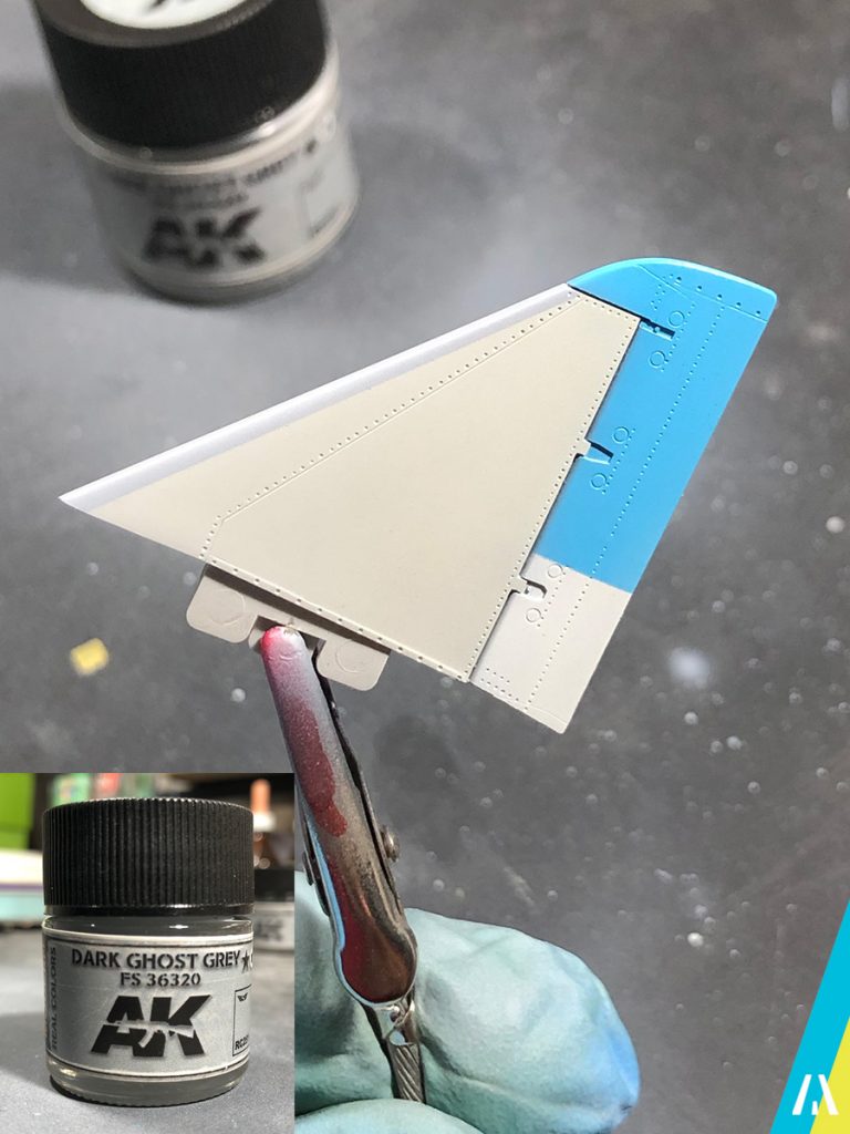 No suelo usar aerógrafo para desgastes y ensuciados, pero era algo que tenía ganas de probar, y en este modelo se suele ver que la parte donde se separa la cola en el fuselaje suele tener un color distinto al resto del fuselaje.