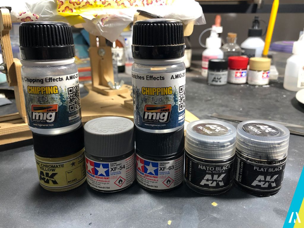Repito el proceso anterior, pero ahora uso scratches effects y aplico un gris mas oscuro, XF-63 de Tamiya. (foto izquierda)