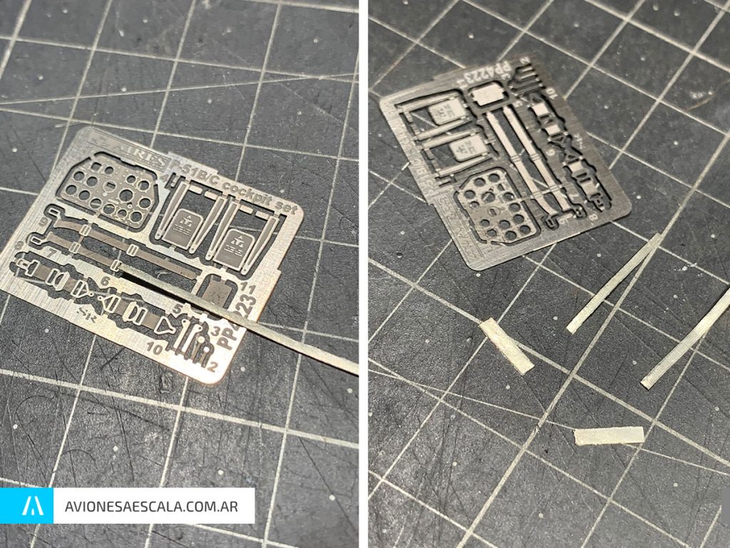 Lo primero que hago es cortar las tiras de los cintos, en este caso tenía un set de fotograbados para otra version del mustang, pero que me sirvieron perfectamente para calcular la escala. Si no lo tienen, pueden hacerlo a ojo también.