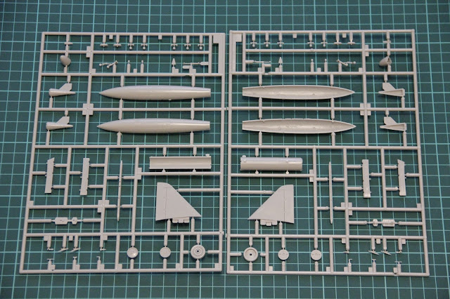 Acá vemos dos sprues similares, que obviamente contienen las mismas partes. Tenemos los planos de cola moldeados en una sola pieza y los tanques externos, además de algunos detalles para el exterior del avión. Las ruedas vienen con la llanta separada en uno de sus lados, de todas formas Eduard incluye mascaras para las ruedas por lo cual no hay que preocuparse mucho por eso.