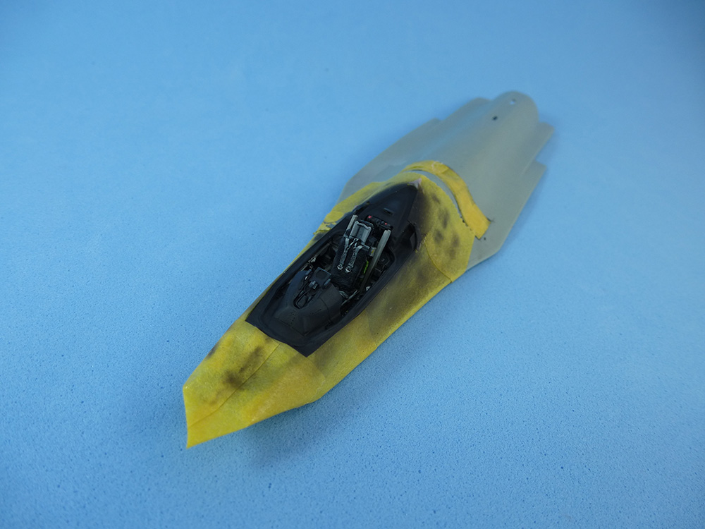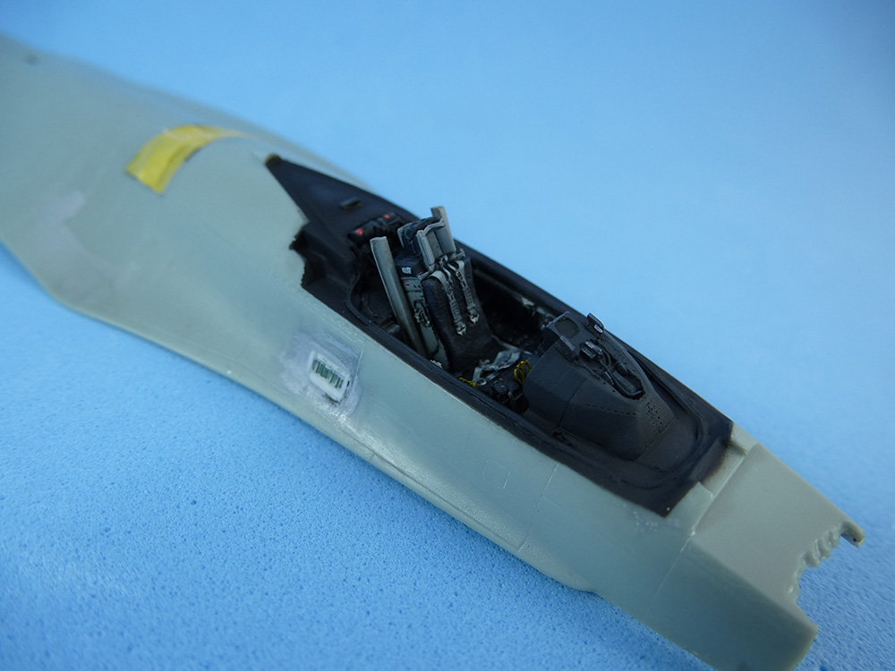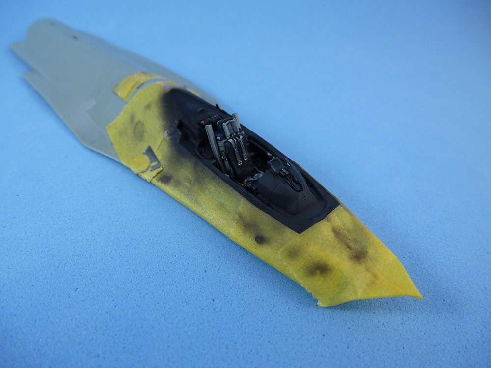 Con sumo cuidado y un poco de masilla logramos adaptar la cabina de resina al fuselaje. Una vez enmascarados los bordes podremos retocar todas las zonas negras alrededor. Aquí podemos jugar con distintos tonos grises, para resaltar mejor los volúmenes.