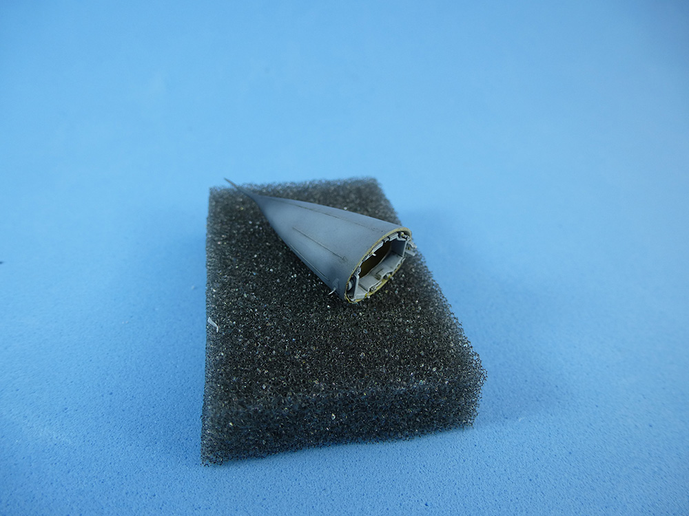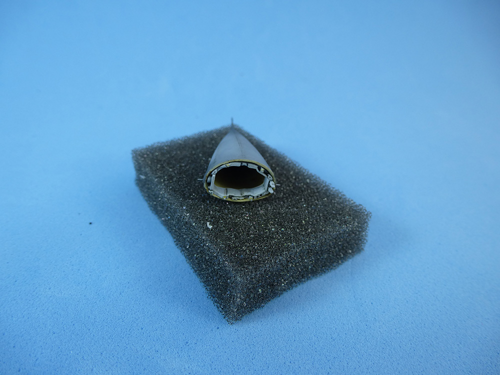 El radomo significó cuidadoso trabajo, no exento de problemas. Lo primero fue cortarlo de las piezas del fuselaje, pues no estaba pensado para ser un componente separado. Una vez separado se finó su interior con minitaladro, masilla y lija.