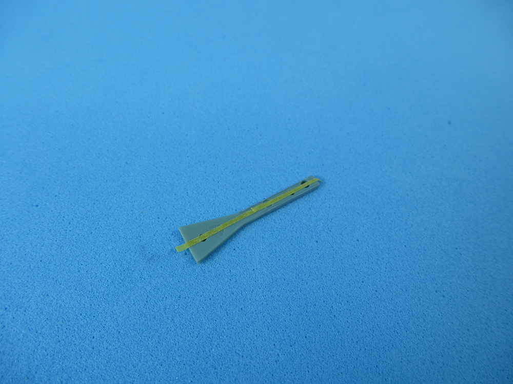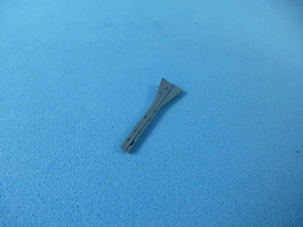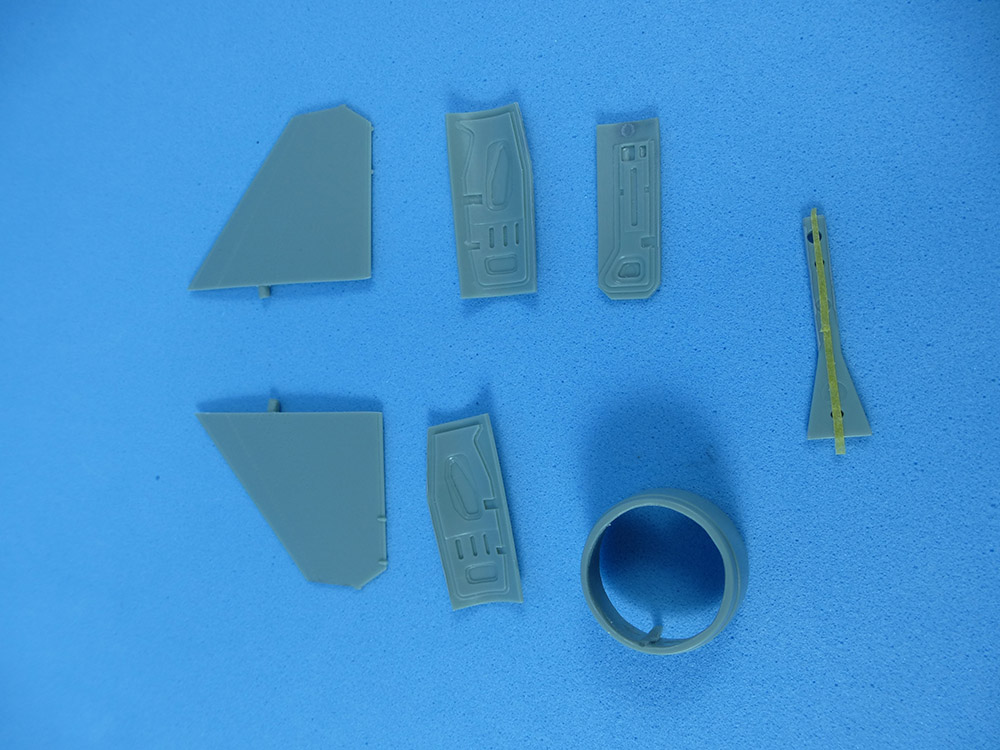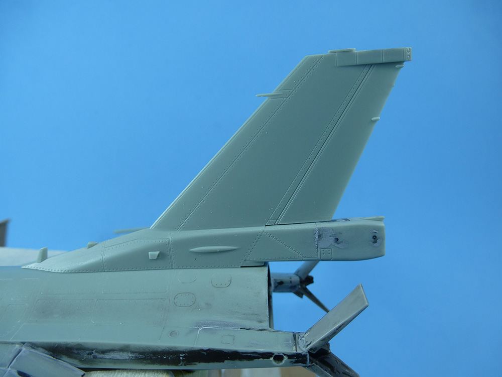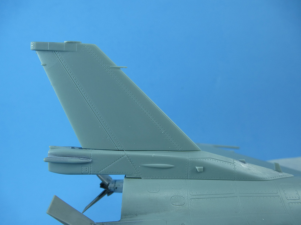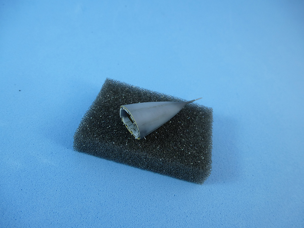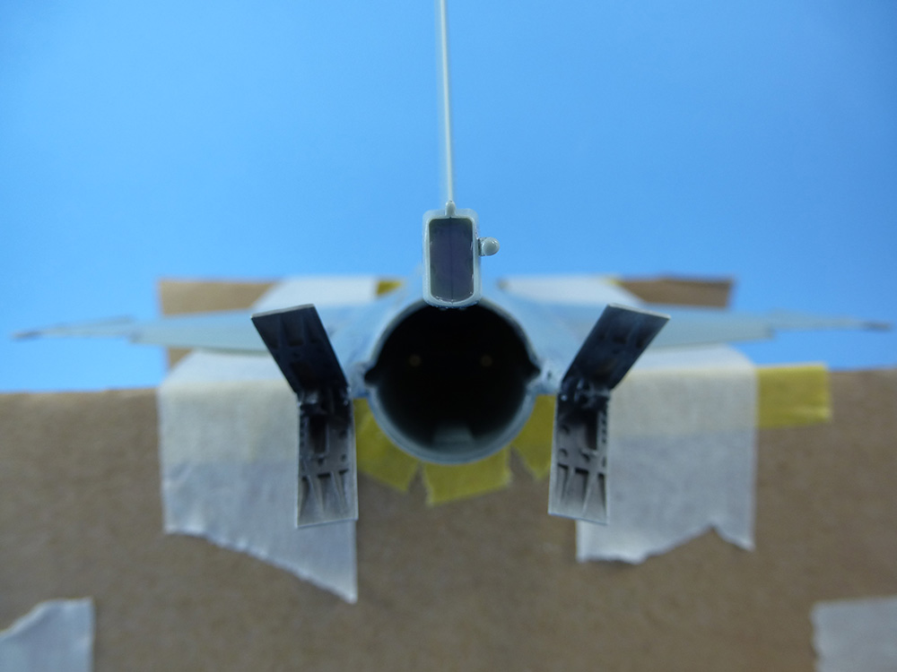 El estabilizador vertical se monta con la extensión del paracaídas y la antena del sistema ECM sólo al lado derecho. El paracaídas se pegará al final para ser pintado aparte, por lo cual se protege su espacio con Maskol, para garantizar una óptima adherencia, sin pintura.