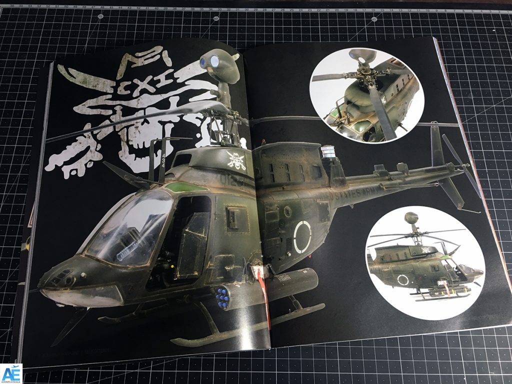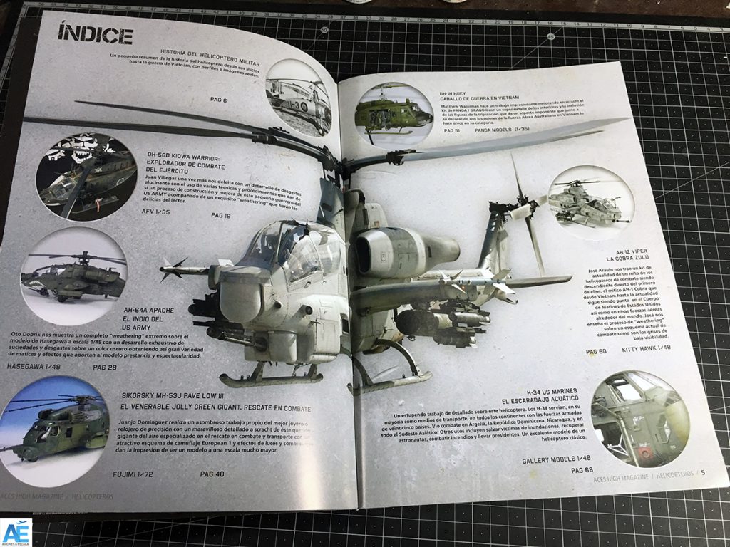 El contenido trata desde helicópteros en 1/72 hasta 1/35, con variadas técnicas de envejecidos y efectos de acuerdo al teatro de operaciones de cada helicóptero.