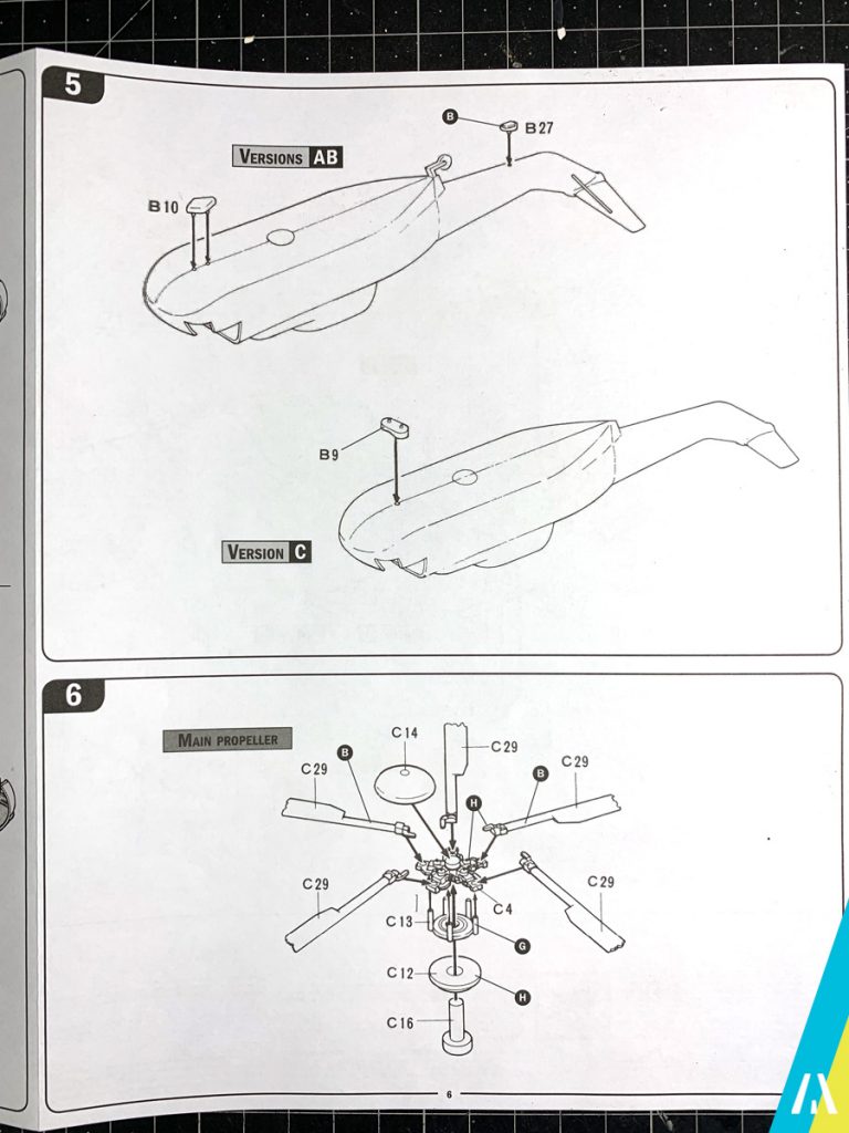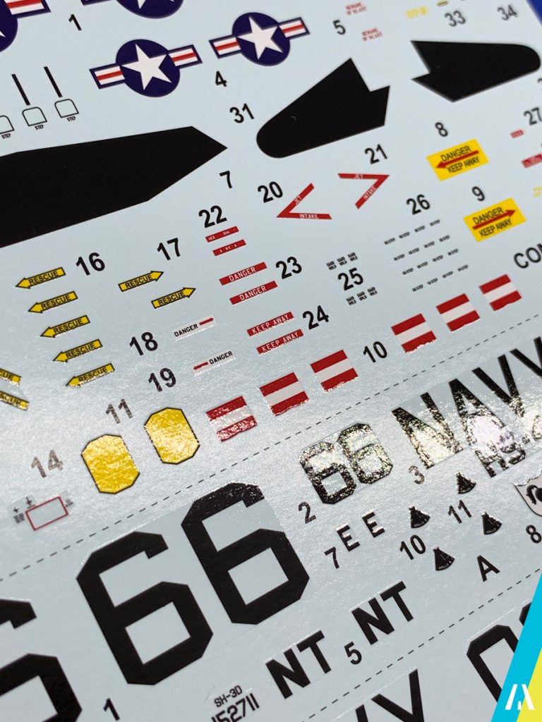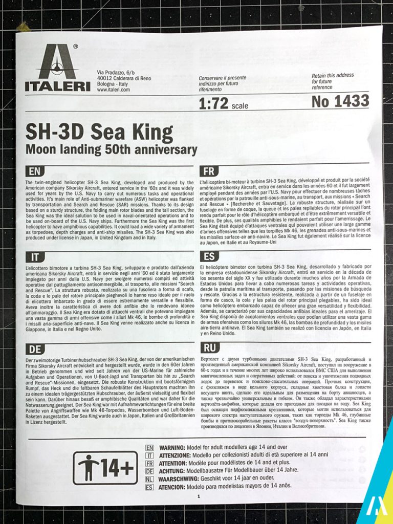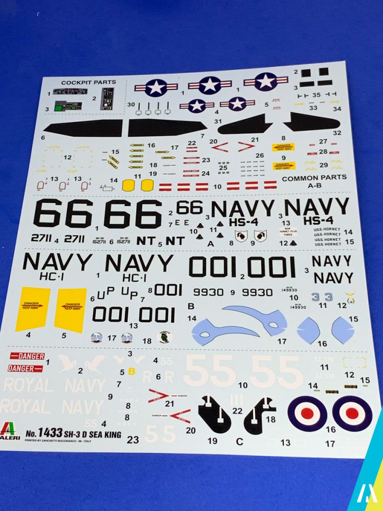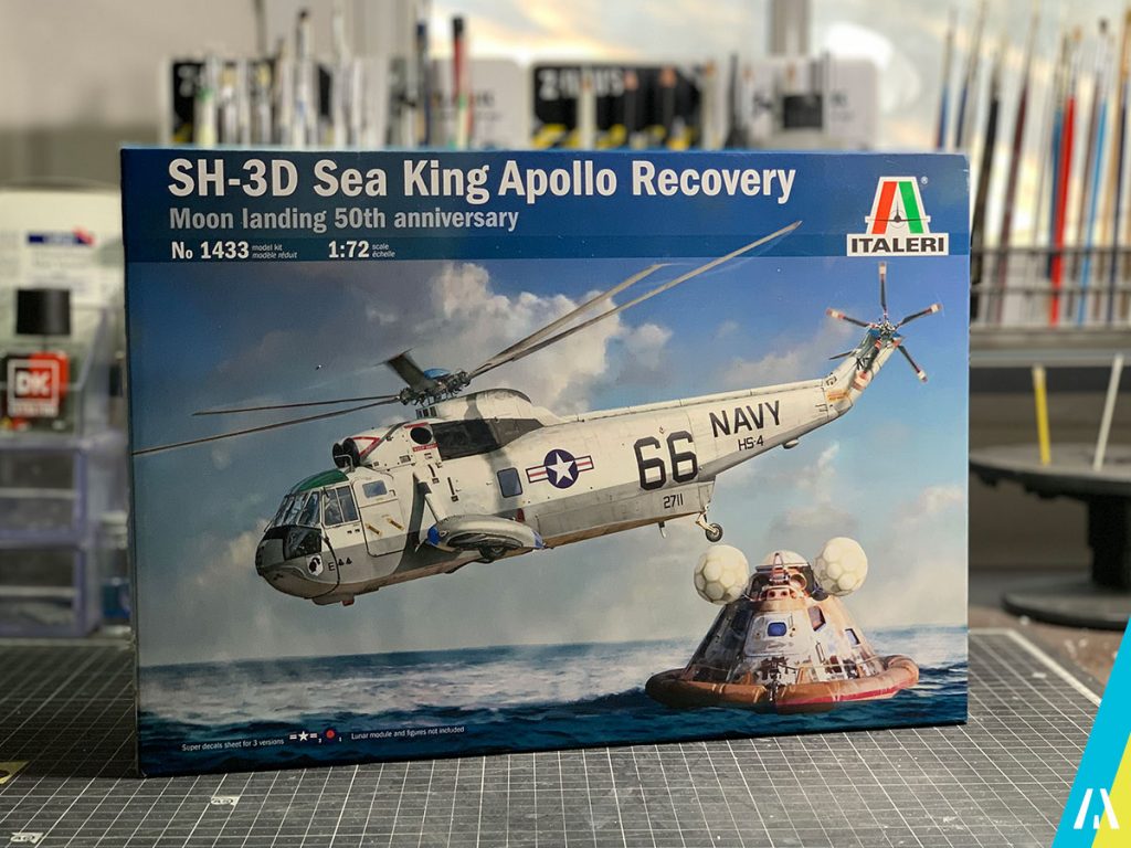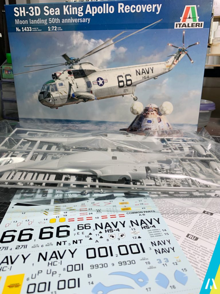 El kit nos permite hacer 3 versiones, una de la Royal Navy y 2 de la US Navy, siendo una de ellas la del escuadrón «Black Knights» que recogió a los tripulantes de la misión Apollo 11 el 24 de Julio de 1969, que será la versión que voy a armar (no se cuando… 😅).