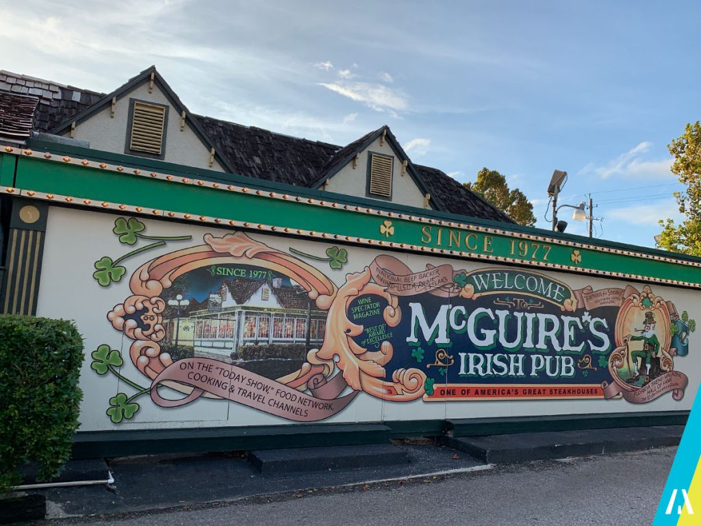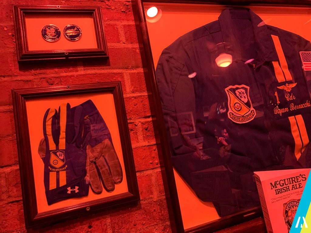 Resulta que en Pensacola hay un bar Irlandés que tiene una sala completamente decorada con cosas de los Blue Angels, cascos, overol de vuelo, guantes, fotos, pinturas, etc… el bar en cuestión se llama McGuire’s Irish Pub