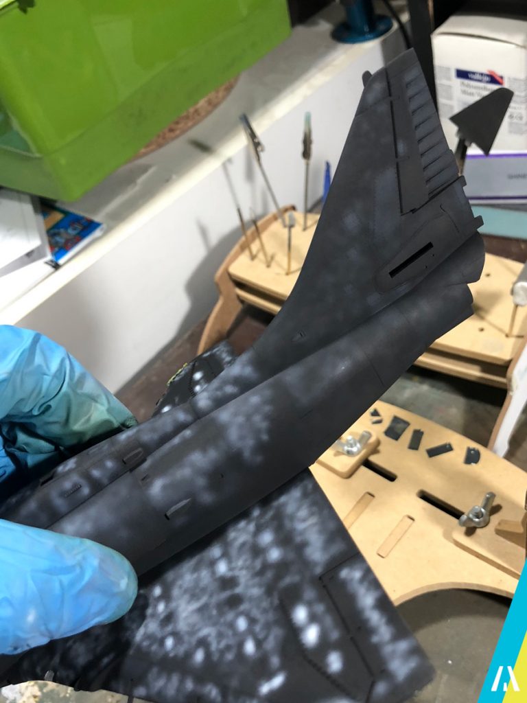 En la cola hago el mismo trabajo pero con tonos grises y azules oscuros, aunque esto poco se va a notar cuando aplique el negro final. En este caso debería haber intentado hacer la técnica con una base blanca e ir llevandola hacia el negro, pero en este caso no es necesario ya que el modelo real no presenta excesivo desgaste.
