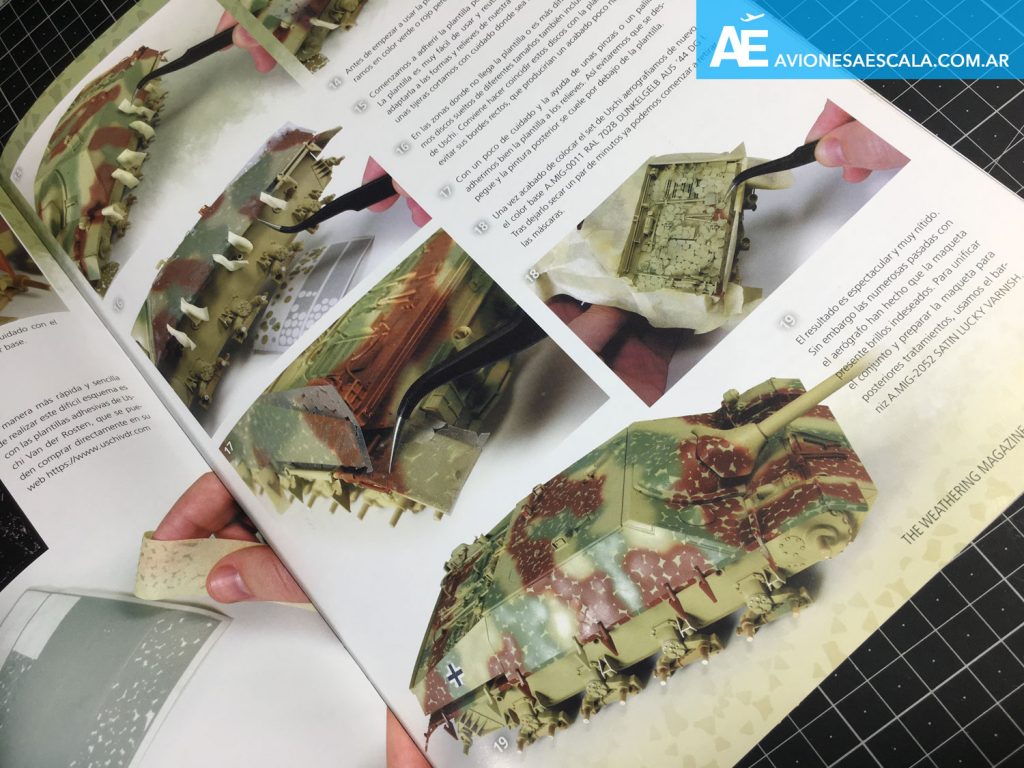 Dejando de lado la tristeza de no poder ver aviones en esta revista, seguimos con los camuflajes, por demás interesante el proceso de pintura de este camuflaje de discos alemán utilizando unas mascaras de Uschi.