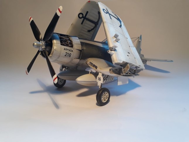 Este modelo era mi primer kit en 1/48 al que le iba a probar varias técnicas que había visto y aprendido pero nunca había puesto en práctica: ensuciado arduo, corte de partes para dejar a la vista, trabajar con oleos, etc. Elegí el Corsair por dos motivos: el primero por mi afición a la Aviación Naval Argentina y como primer ejemplar de un proyecto ambicioso de construir la mayor cantidad de aparatos que usa o usó la Armada Argentina, y segundo porque me habían recomendado el kit.